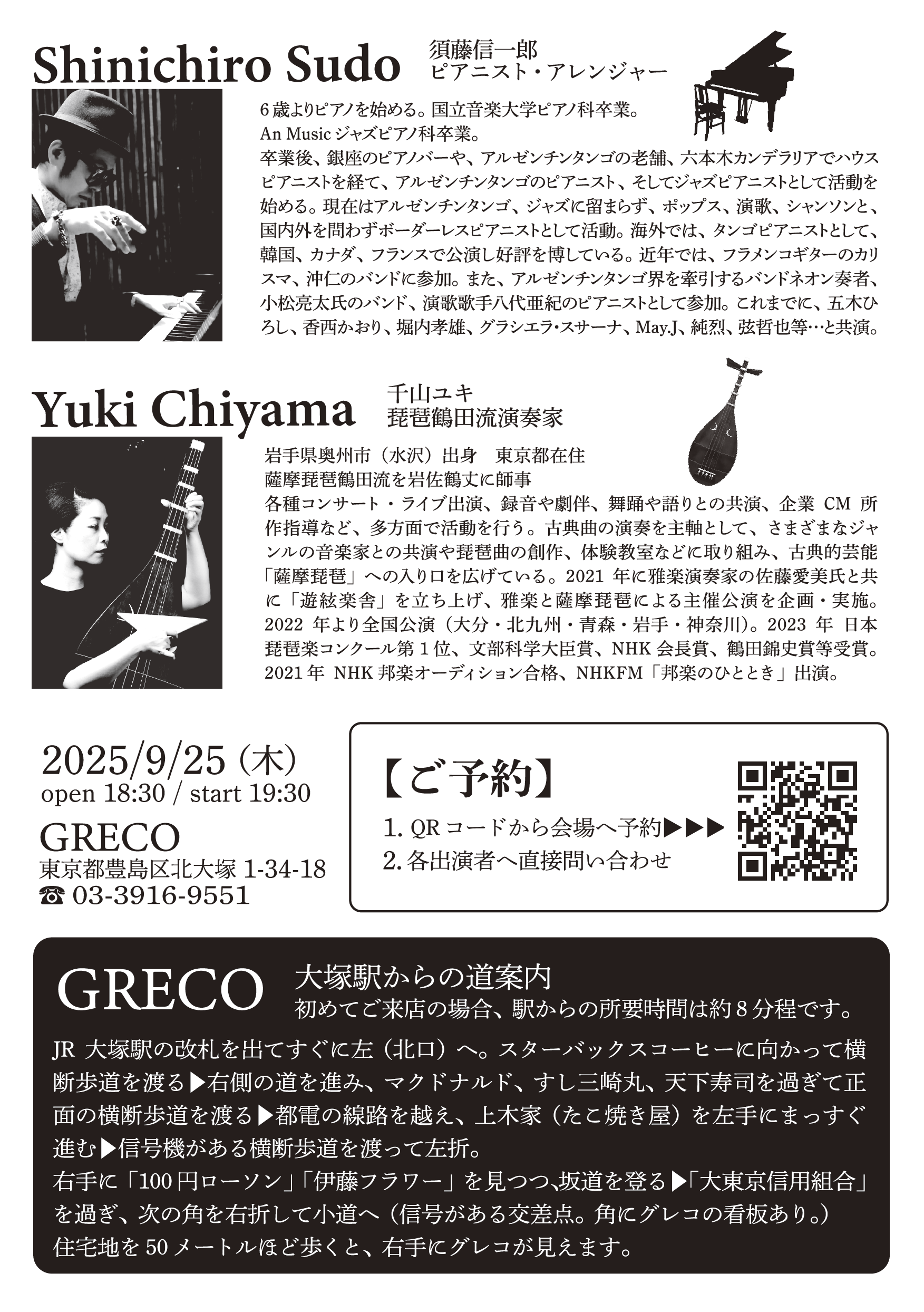【終了】Piano×Biwa 大塚GRECO 2025.08.09 2025.10.18 Jazz 千山ユキ 演奏会 琵琶 薩摩琵琶 ご予約は直接出演者宛でも承ります。それぞれのソロ演奏の他、即興セッションなどを予定。ぜひ。 Tweet Share Hatena RSS Pin it Spotifyで琵琶が聞けます 前の記事 【終了】Piano×Biwa 東銀座 次の記事